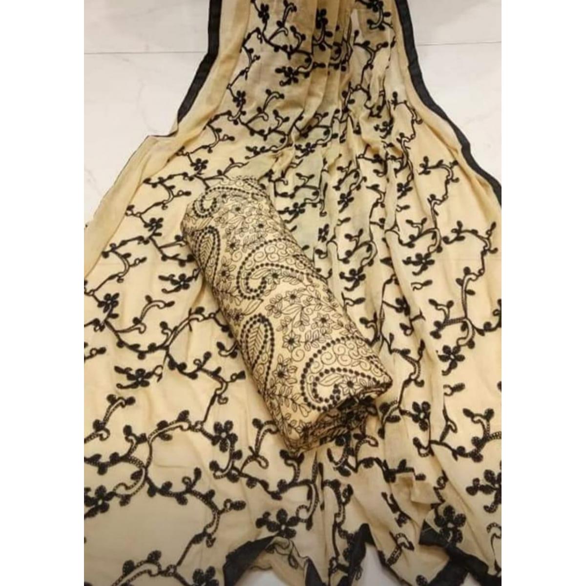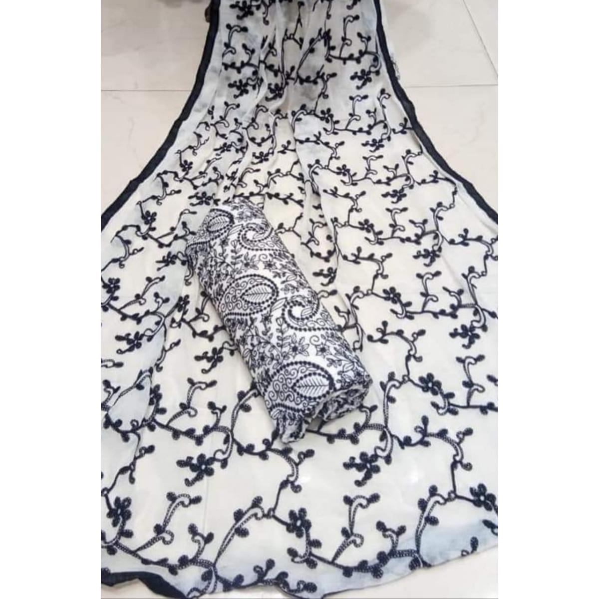 Cotton Chikankari Dhaga Work Top, Cotton Bottom, Chiffon Embroidery Dupatta