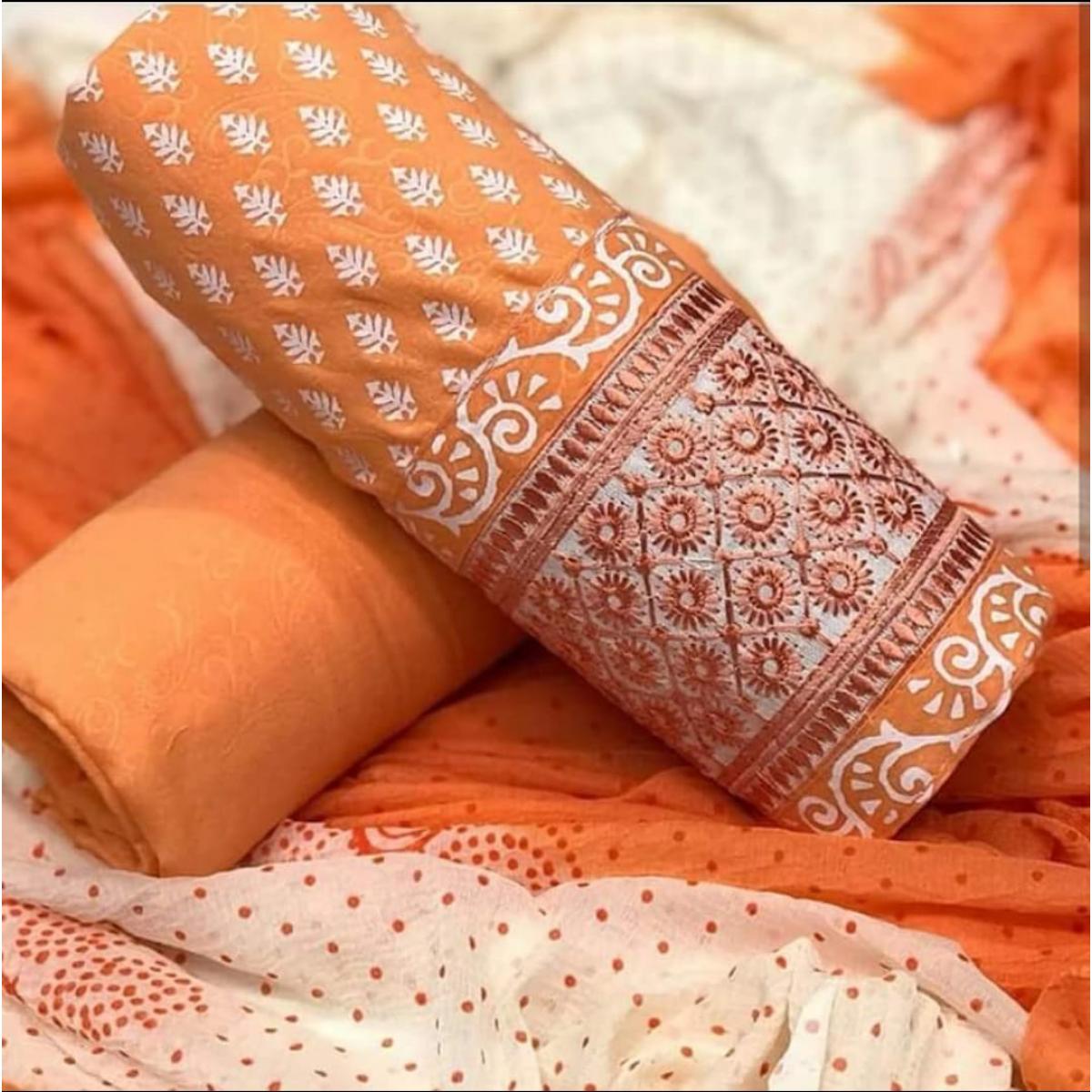 Cotton Printed Daman Embroidery Top, Cotton Bottom, Chiffon Dupatta